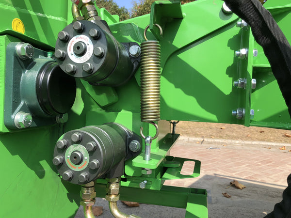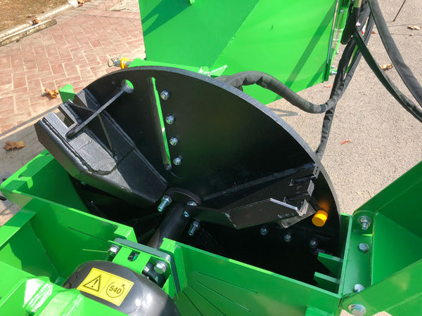Easy maintenance. For transportation of the chipper, the large input chute can be easily folded up by only one person and can be secured without any tools. By removing only one bolt, you get access to the rotor and knives of the Nova Tractor BX72RSH wood chipper, making maintenance jobs are matter of minutes. The extremely heavy 220lbs rotor disc creates a very strong air flow with its special design winglets, so that stuck material inside the chipper is virtually impossible. Since the hydraulic rollers can turn backwards instantly, blocked material in the input chute can be pulled out of the chipper within seconds.