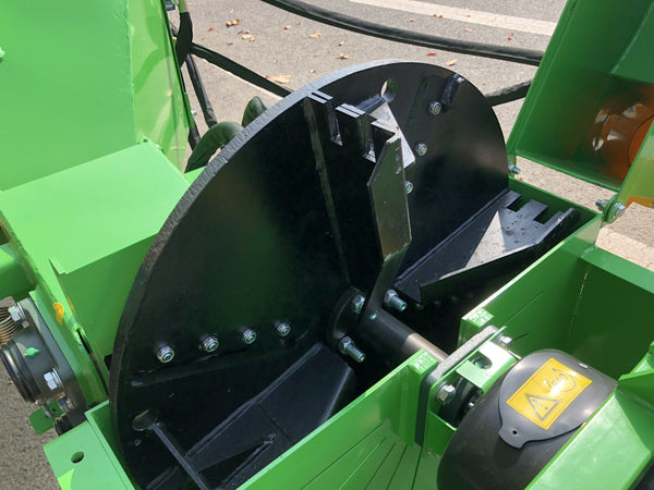 Super heavy duty flywheel. Four 9.5inch long reversible knives, made of A8 level hardened tooling steel, are mounted on a 3/4inch wide and 220lbs heavy rotor of the BX72RSH wood chipper. Wood of up to 7inch diameter can be chipped into 1/2 to 2 inch sized pieces. Additionally mounted winglets on the rotor create the necessary air flow needed to guide even difficult material through the chipper. Inside the massive rotor housing additional replaceable branch breakers are mounted to even shred small branches efficiently.