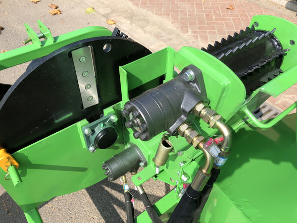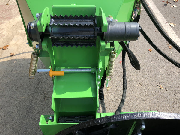 Tractor independant built-in hydraulic system. The Nova Tractor BX72RSH wood chipper offers best performance at 60 to 70hp tractor engine power. Wood branches are pulled into the wood shredder using the built-in tractor independent hydraulic system, driving 2 opposed feeding rollers, which drag in the wood into the wood chipper. The Nova Tractor BX72RSH offers fast and easy operation. The two infeed rollers are mounted with ball bearings on each side so that both rollers are firmly guided, unable to tilt in any direction. The large safety bracket operates the hydraulic functions (IN - OUT - STOP) of the feeding rollers, so that almost all wood jams can be easily solved by the "reverse" gear. Your tractor does not need any hydraulic connectors. The included safety PTO shaft with friction clutch drives the wood chipper and the integrated hydraulic system that comes with tank, pump and all the necessary pipes. Depending on your tractor´s PTO speed the built-in hydraulic system creates up to 250bar pressure, pumping up to 12L/min hydraulic oil from the 12L tank mounted on the BX102RSH shredder.