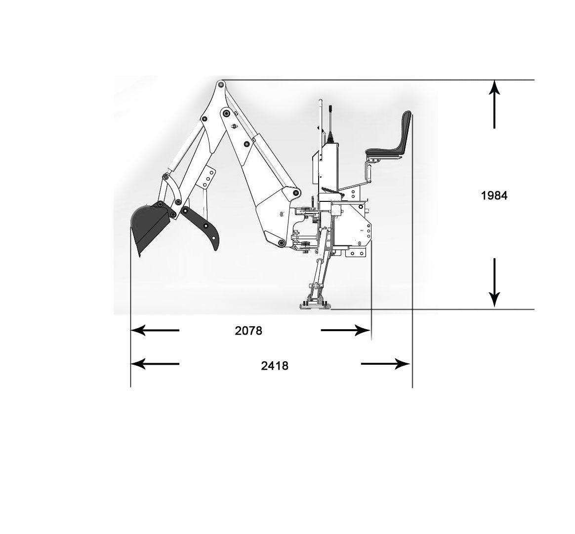 The BH-7 can also stay mounted to your tractor when you drive on public roads, as it does not cover any lights and the hydraulic stabilizers give the backhoe very compact transport dimensions: 71x51x48 inches (HxWxD). The max. working height is 120", the working radius is 116" and the max. working depth is 80".