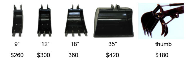 All the BH7 come with15" width bucket as standard, we supply other size buckets as option include 9", 12", 18", 35", and we supply backhoe "thumb" which is a perfect grabbing device together with the buckets.